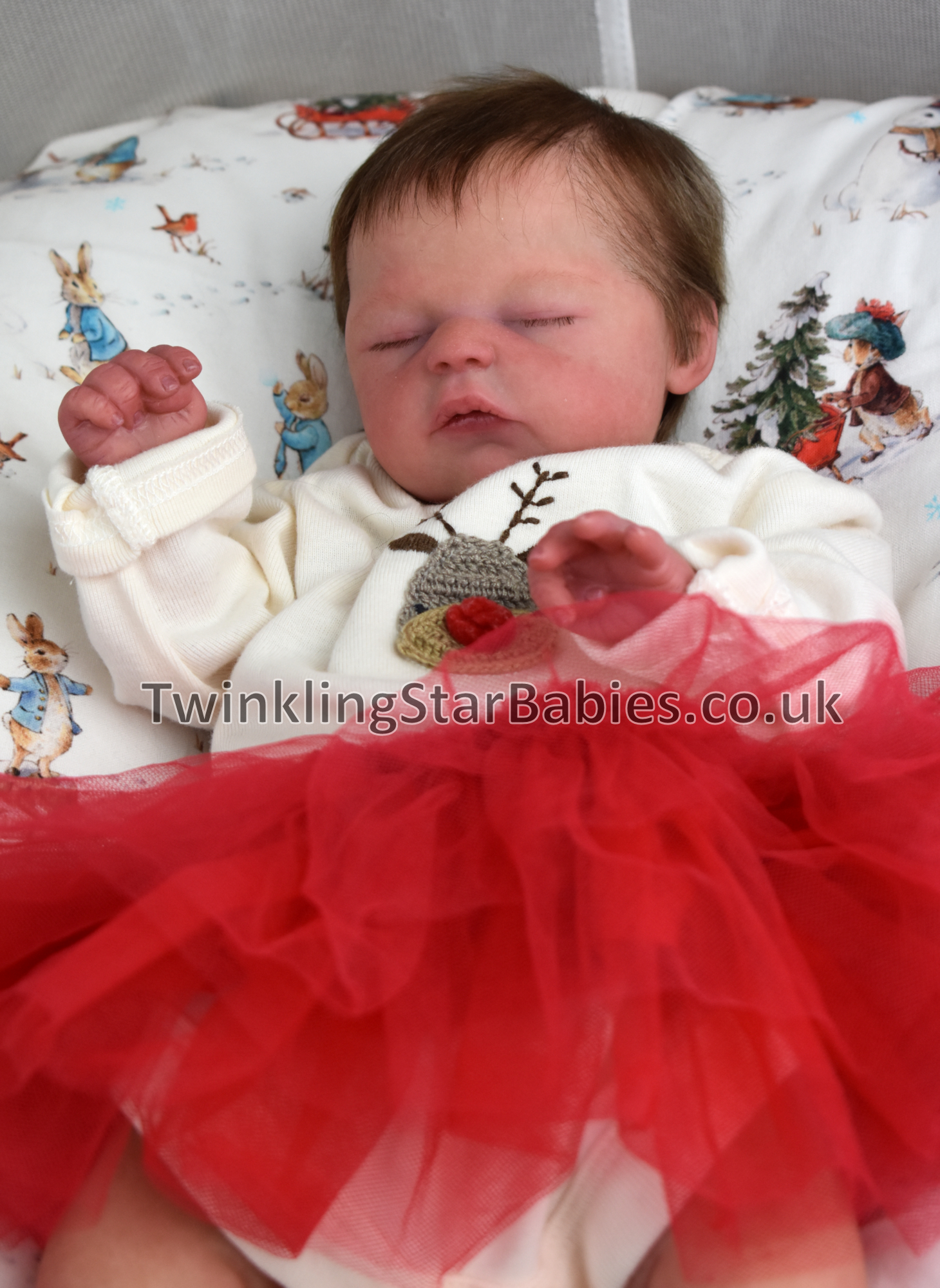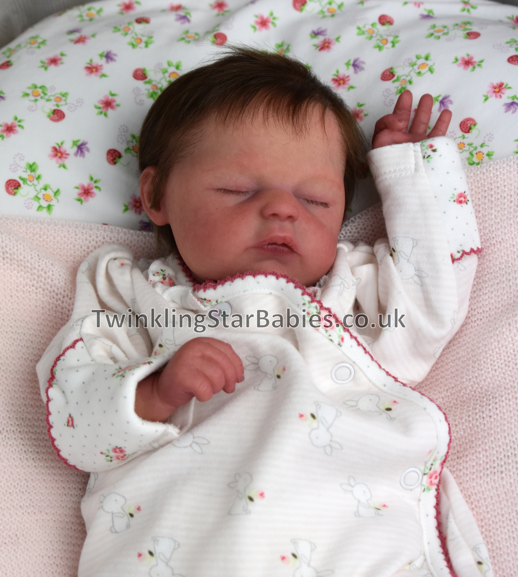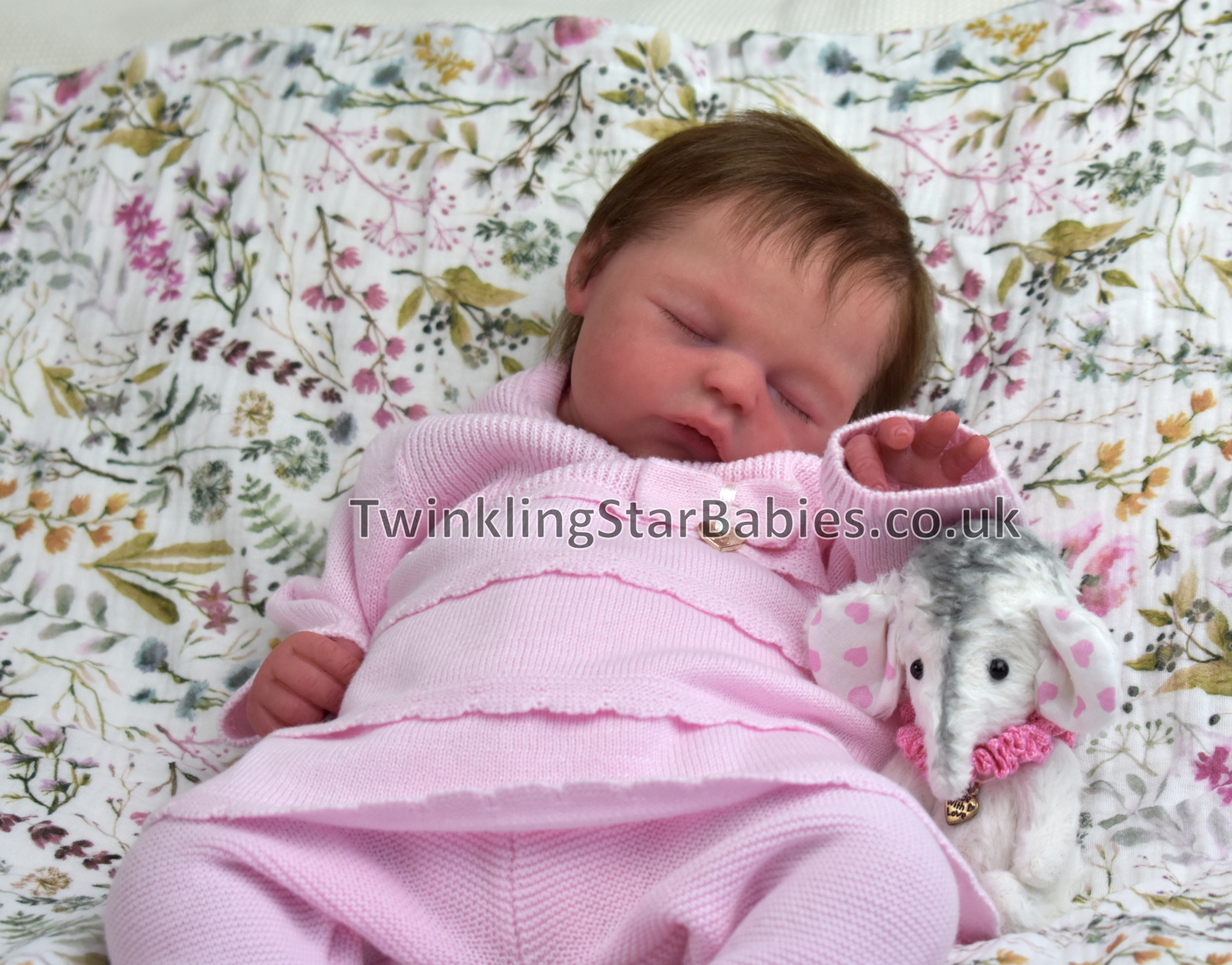 Baby Sierra has been created from the reborn kit sculpted by Maisa Said. She is a preemie baby approx 15.5″, and has full arms, full legs and a beige doe suede body.
